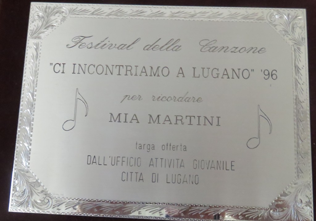 Anno ’96 presentavo alla stampa, la prima edizione del festival internazionale “Ci incontriamo a Lugano”?!.Definito a un treno partenza da Lugano, gira l’Europa, fine gennaio torna a Lugano. La prima edizione è un successo, il Comune di Lugano, mette a disposizione una targa d’argento per ricordare l’artista Mia Martini. La Safm Records… premia con targa d’argento alla carriera Danilo Verde artista di fotoromanzi. Entusiasmo alle stelle, la prima edizione viene archiviata. Si parte con la seconda. Il mio compito direttore artistico della manifestazione. Mi creo un immenso lavoro. Mi occupo della selezione dei testi e scrivere sui giornali. Nel 1996 date alcune incertezze, per il direttore artistico del Festival di Sanremo… invio la mia candidatura con progetto per le selezioni. In data 30 settembre mi scrivono e mi ringraziano per la richiesta. Scrivere sui quotidiani è la mia passione. Rivolgendomi ai giovani, a coloro che scelgono di auto prodursi. Spendono gran parte del loro budget a disposizione. Trovandosi poi a corto di soldi, per la promozione. Argomento attuale ancora oggi. “Targa d’argento alla memoria di Mia Martini”.