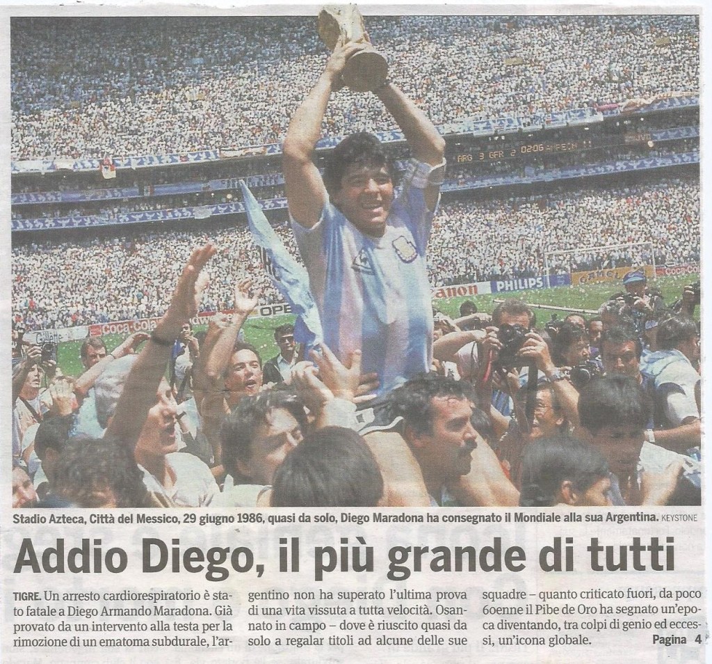 BUENOS AIRES, 25 NOV – El ex astro argentino Diego Maradona falleció hoy tras sufrir un paro cardio-respiratorio, informó hace minutos el portal del diario “Clarín”, noticia de la que se hicieron eco distintos medios de prensa locales. Según el mismo medio, el ex campeón mundial, de 60 años, fue asistido por personal médico en el barrio San Andrés, de la localidad de Tigre, periferia norte de la ciudad de Buenos Aires en la que se encontraba alojado. Allí realizaba su recuperación tras la operación a la que fue sometido hace algunos días en una clínica de la localidad de Olivos, distante a unos pocos kilómetros, para extraerle un edema subdural. Riposa in pace