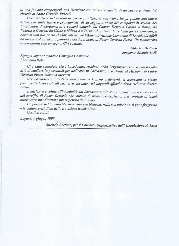 Padre Gerardo Fusco, ha portato nel lontano Messico e, nella sua bisaccia… Nella sua missione, il pane fragrante e la cultura cristallina della tradizione lacedoniese. Sull’alto di una fontana campeggia una iscrizione con un nome, quello di un nostro fratello: “A ricordo di Padre Gerardo Fusco”.