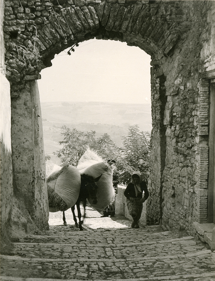Nella foto una signora con l’asino che trasporta paglia o fieno.